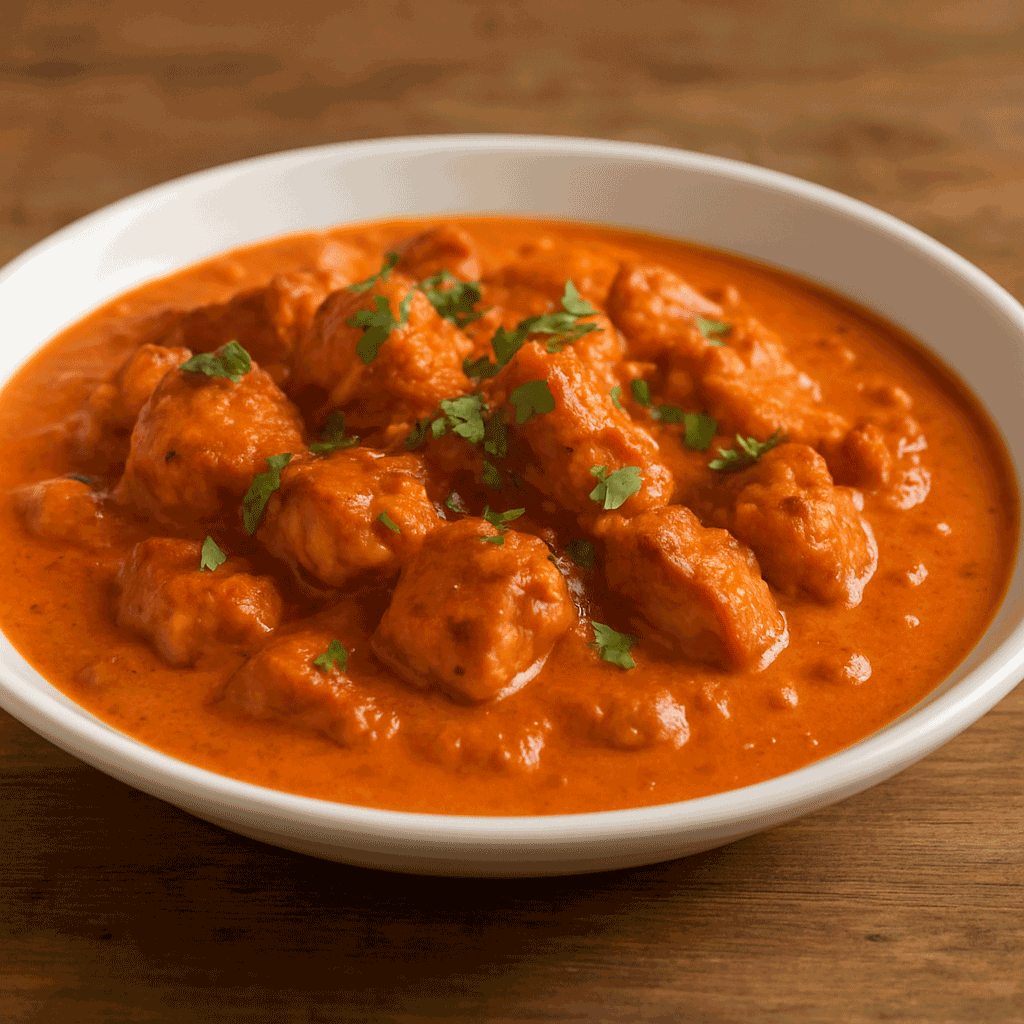 Boneless chicken marinated in yogurt and spices, served in a tomato cream sauce. Slow-simmered spice and comfort.