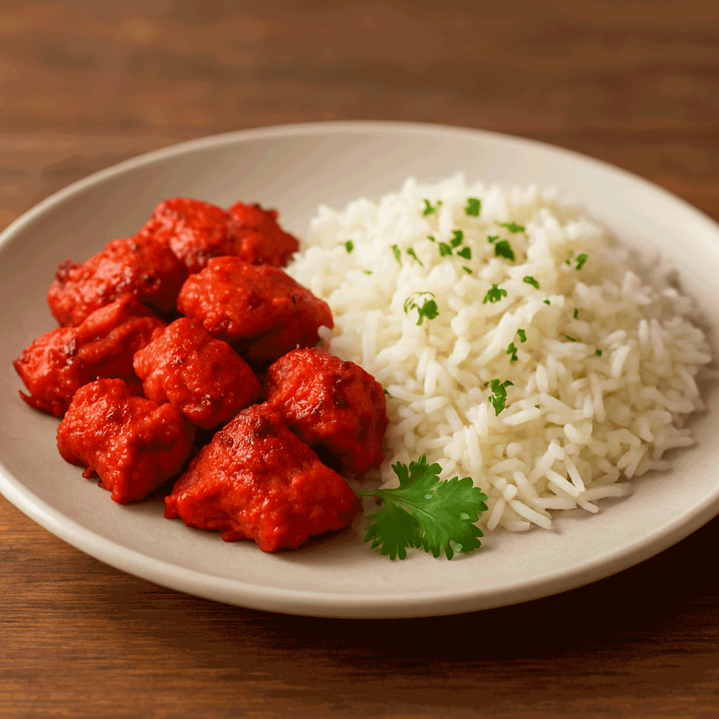 Tender chicken tikka with mild spices, served with fluffy rice—simple, flavorful, and kid-friendly with its bright red color!