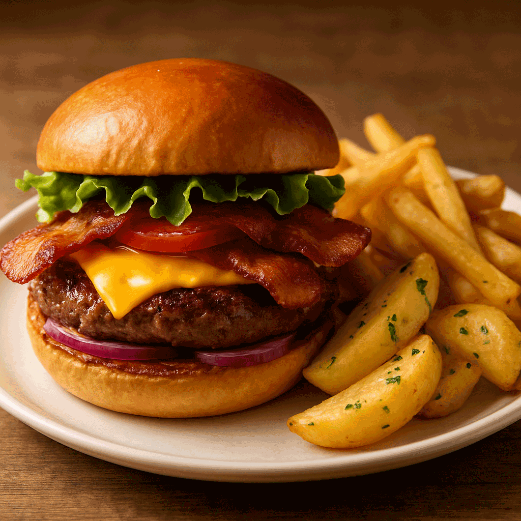 A classic done right. Choose a juicy 7 oz. Angus beef patty or an 8 oz. grilled chicken breast, cooked to perfection and topped with American and cheddar cheeses. Finished with fresh tomato, crisp lettuce, and sliced onions, this hearty burger delivers timeless American flavor with a satisfying, made-to-order bite.