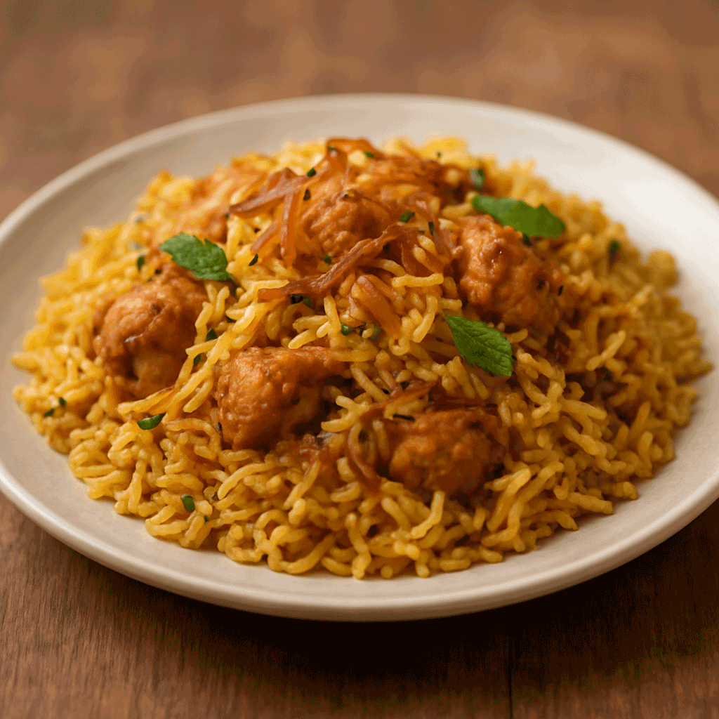 Biryani is one of the most celebrated rice dishes of the Indian subcontinent, known for its fragrant basmati rice, layered spices, and slow-cooked depth of flavor. With roots tracing back to royal kitchens, biryani was traditionally prepared for feasts and special occasions, where carefully spiced rice and marinated proteins were cooked together to create a richly aromatic, celebratory dish.
