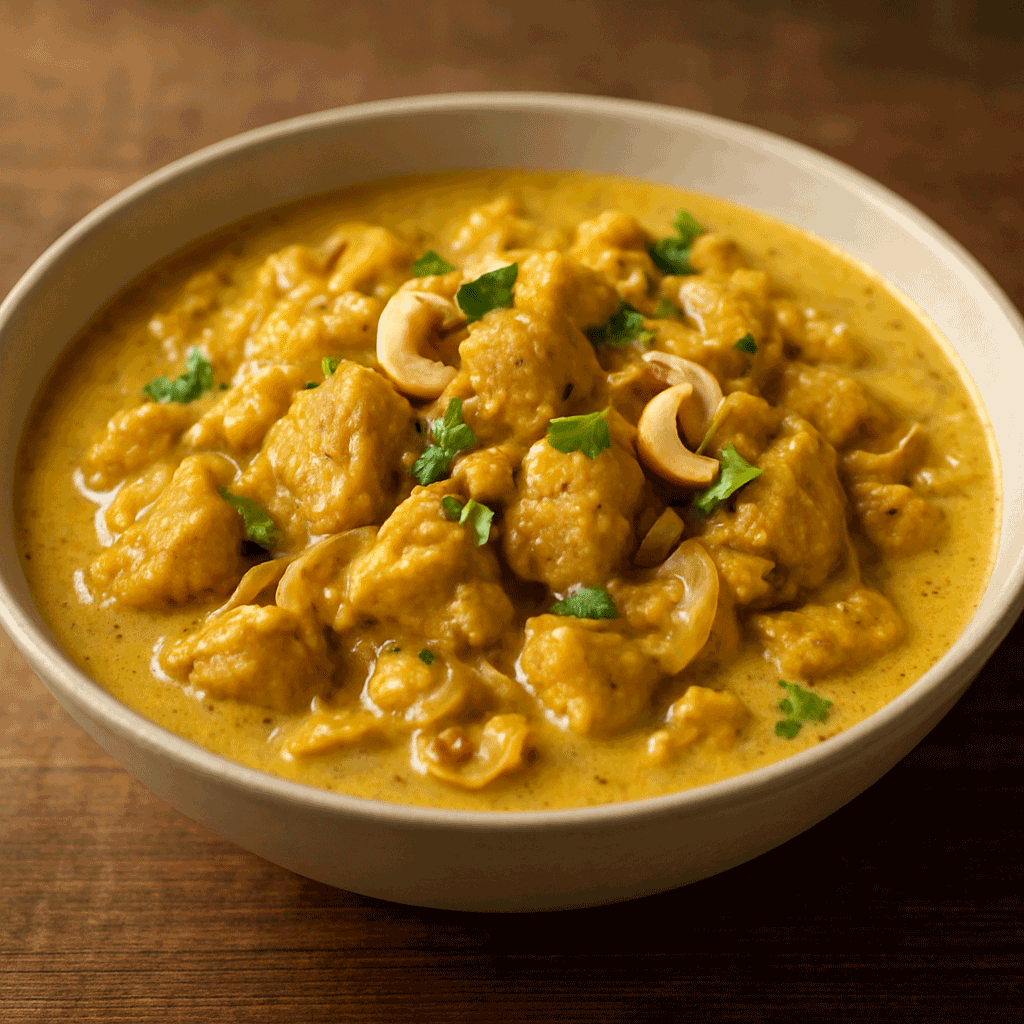 Korma is a rich, mild curry rooted in the royal kitchens of North India and the Mughal Empire, where cashews were commonly used to create luxurious, velvety sauces. This dish is known for its gentle spice, subtle sweetness, and creamy texture rather than heat.